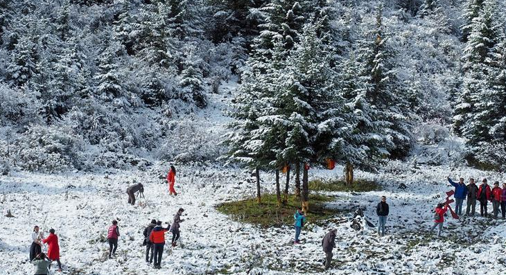 當日,一場夜雪后,川藏線高爾寺山至理塘路段披上了一層銀裝。雪山、牦牛、云朵、松林,帶來了濃濃的雪域風(fēng)情。