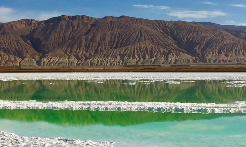 在青海柴達木盆地最西部的茫崖有一處硫酸鎂亞型人工鹽湖,以其翡翠綠色的鹽田與藍(lán)天白云和附近的丹霞地貌相映。