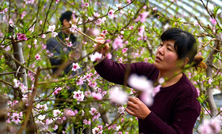 隨著氣溫升高,河北省邯鄲市邯山區(qū)碩果春農(nóng)業(yè)園大棚內(nèi)的桃花競(jìng)相綻放。