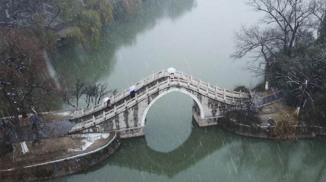 1月15日,安徽省合肥市迎來降雪天氣。雪中的合肥市包公園景色別致。
