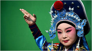3月3日,李金玲在鄭州文化館通過直播的形式進(jìn)行帶妝表演豫劇《花木蘭》選段。