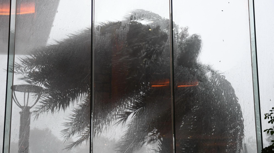 2020年8月4日,浙江樂清一酒店的景觀樹在臺風(fēng)中大幅搖動。