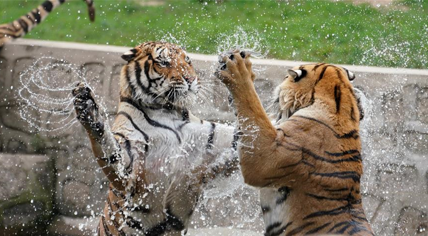 7月28日在橫道河子?xùn)|北虎林園拍攝的在水中納涼的東北虎。時值盛夏,位于黑龍江省海林市的橫道河子?xùn)|北虎林園的東北虎活動量減少,以不同方式消夏納涼。