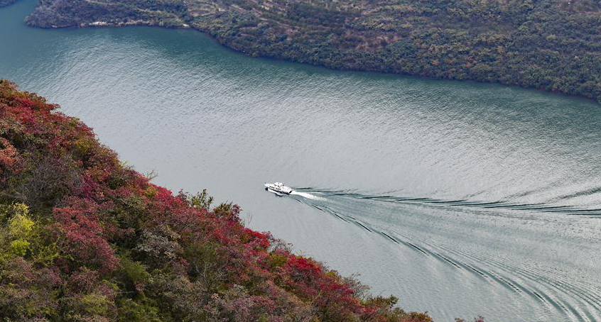 11月23日,游客在位于長江巫峽段的巫山文峰景區(qū)游覽。初冬時節(jié),位于重慶巫山縣境內(nèi)的長江巫峽段呈現(xiàn)出一江碧水東流、兩岸層林盡染的秀美景象。