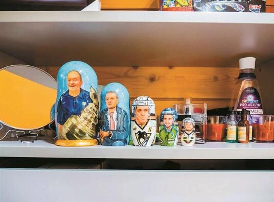 說(shuō)起來(lái),老烏沙科夫和中國(guó)也有點(diǎn)緣分,因?yàn)樗膬合眿D是一位來(lái)自中國(guó)杭州的女孩。烏沙科夫的家處于莫斯科郊外的富人區(qū),其實(shí)當(dāng)你踏入他家大門,就能立刻感覺踏入了一個(gè)冰球運(yùn)動(dòng)員的世界。墻角里擺放著的全是冰球桿,家里的各種裝飾也都是由冰球桿以及各種海報(bào)組成的。最有趣的是,套娃和伏特加酒瓶上,都特別定制著老人的照片?!斑@個(gè)很棒!”記者指著套娃說(shuō)道,而老烏沙科夫聳聳肩,表示很淡定。