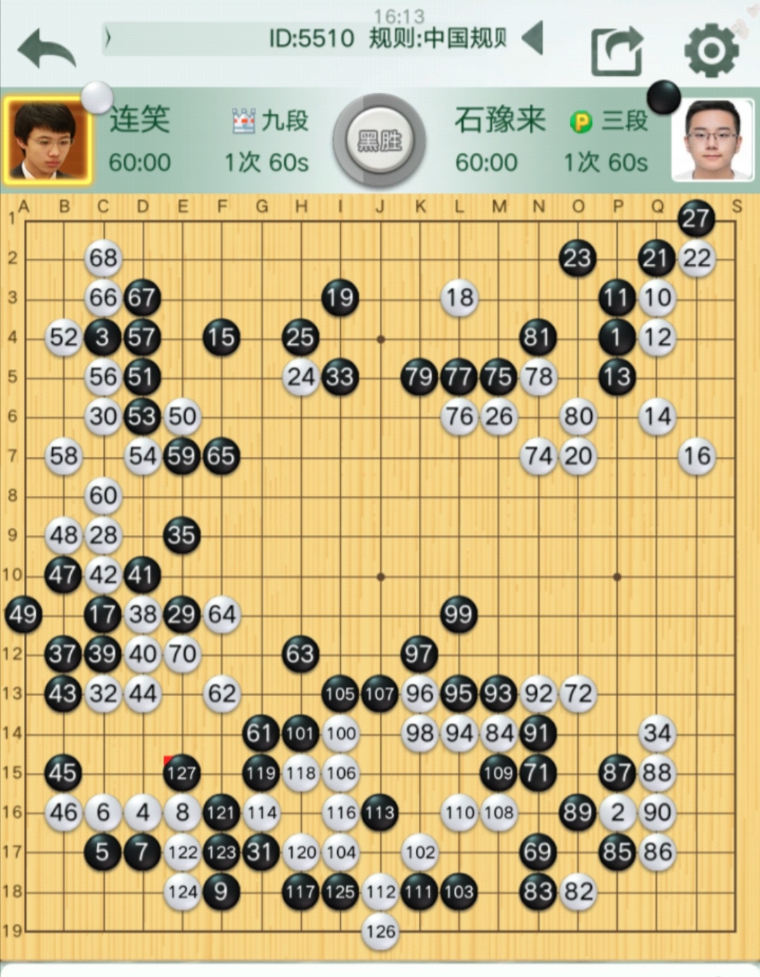 第四臺(tái)連笑九段VS石豫來三段(對(duì)局棋譜)。石豫來又發(fā)猛力,再下一城。連笑九段前三輪皆敗,本輪執(zhí)白對(duì)石豫來三段,先手壓縮上邊盤黑陣后優(yōu)勢在握,但隨即白棋打入下邊盤黑陣全部遭屠,連笑再敗一局,狀態(tài)低迷之極。