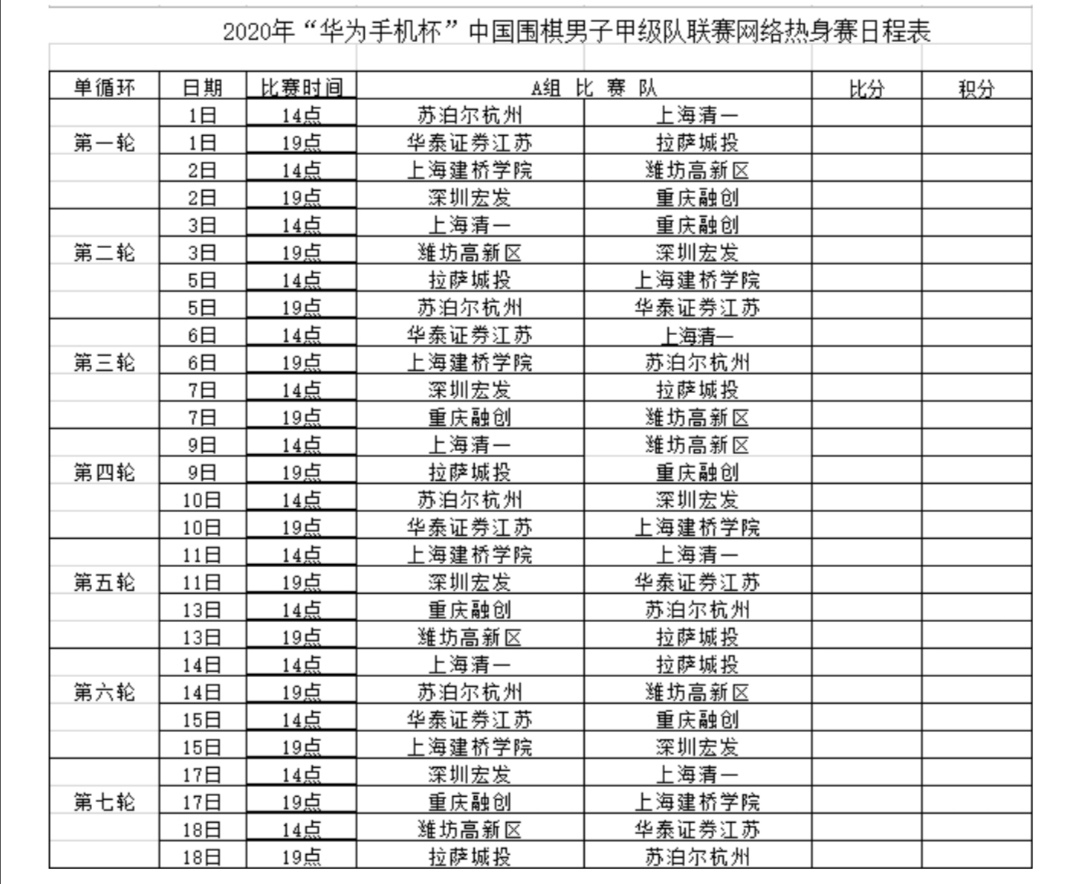 附2:2020年“華為手機(jī)杯”中國圍棋男子甲級(jí)隊(duì)聯(lián)賽網(wǎng)絡(luò)熱身賽AB兩組日程表