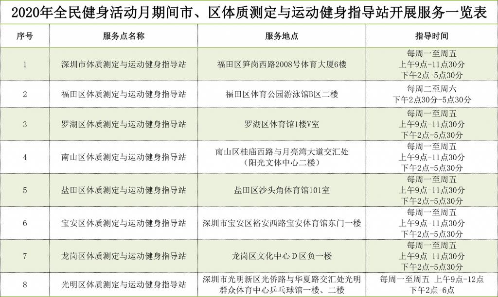 2020年深圳全民健身活動月期間體質(zhì)測定服務(wù)表: