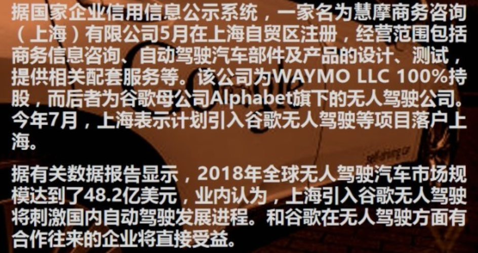 谷歌母公司Alphabet旗下研究自動(dòng)駕駛的部門(mén)Waymo在自動(dòng)駕駛領(lǐng)域處于全球領(lǐng)先水平,當(dāng)前其已經(jīng)完成800萬(wàn)英里(約1287萬(wàn)公里)自動(dòng)駕駛汽車公共道路測(cè)試,模擬測(cè)試?yán)锍踢_(dá)到50億英里(約80.47億公里)。Waymo計(jì)劃在為今年下半年向部分地區(qū)的美國(guó)消費(fèi)者推出無(wú)人駕駛服務(wù)。