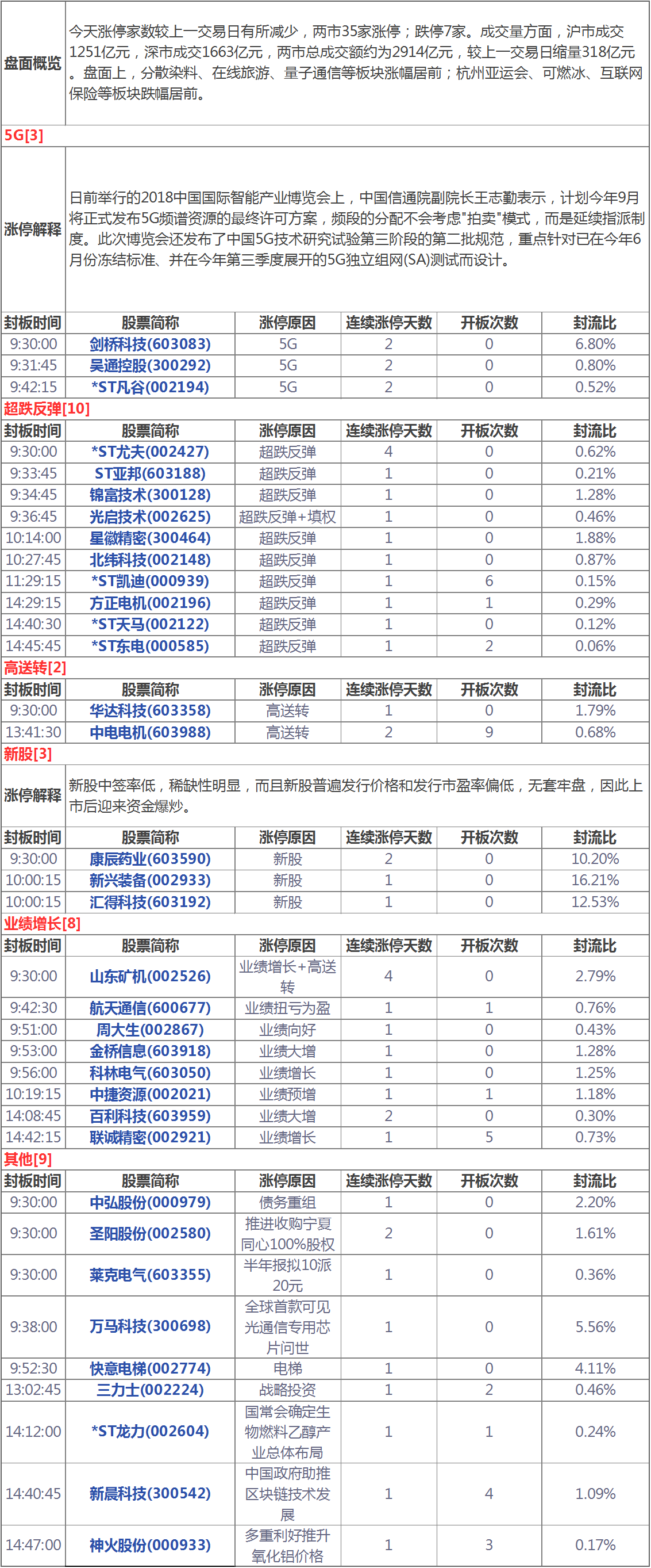 今天漲停家數(shù)較上一交易日有所減少,兩市35家漲停;跌停7家。成交量方面,滬市成交1251億元,深市成交1663億元,兩市總成交額約為2914億元,較上一交易日縮量318億元。盤面上,分散染料、在線旅游、量子通信等板塊漲幅居前;杭州亞運(yùn)會、可燃冰、互聯(lián)網(wǎng)保險等板塊跌幅居前。