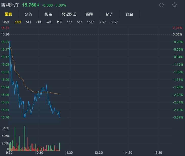 截至發(fā)稿,吉利報15.7港元,跌3.08%。(文文)