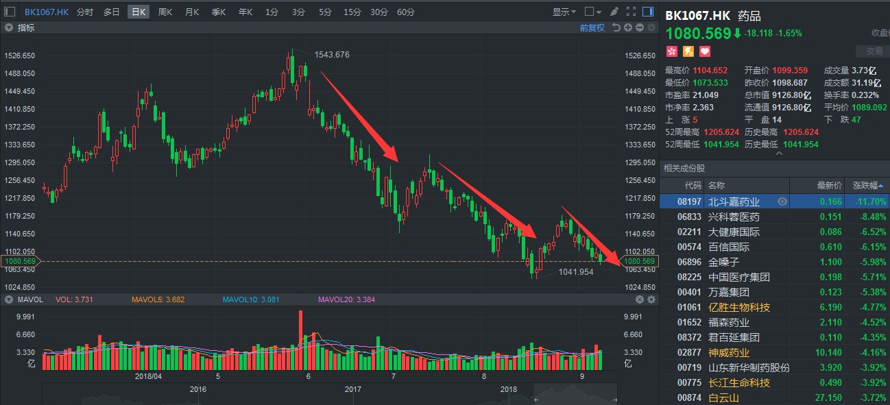 據(jù)智通財(cái)經(jīng)APP觀察,截至9月10日,上證跌了1.21個(gè)點(diǎn);恒指跌幅超過(guò)1.33%,50只成分股,僅包括九龍倉(cāng)置業(yè)(01997)在內(nèi)的6只股票小范圍飄紅,而醫(yī)藥板塊方面,繼續(xù)下挫,普遍以“掛綠”收盤,大勢(shì)可謂慘不忍睹。