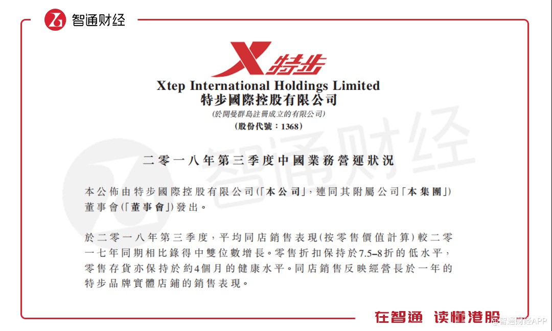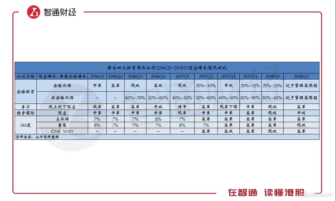 智通財經(jīng)APP根據(jù)公開資料整理發(fā)現(xiàn),特步過往季度的同店銷售增長水平時常保持在中單位數(shù)甚至低單位數(shù)的增長水平,直到2018年一季度才實現(xiàn)低雙位數(shù)增長,這也是公司自2013年一季度開始披露這一數(shù)據(jù)以來,首次達到雙位數(shù)增長。