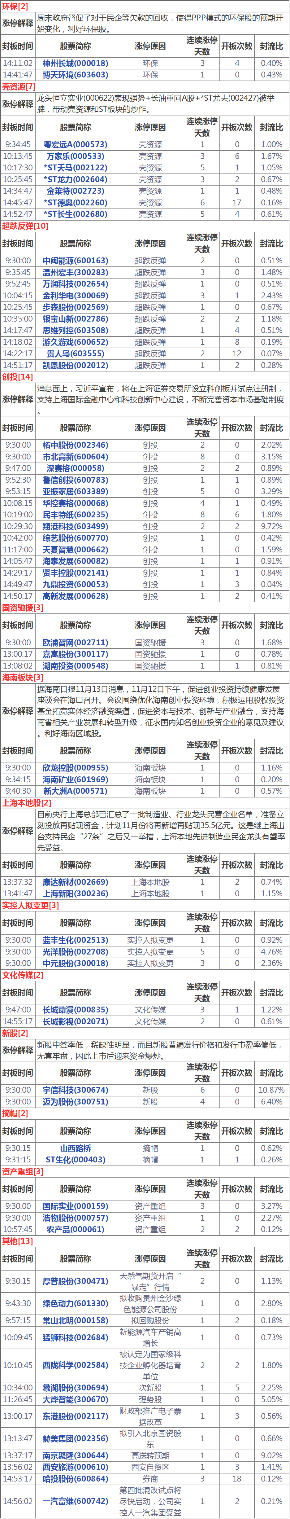 11.14漲停分析 創(chuàng)投個(gè)股分化殼資源炒作降溫