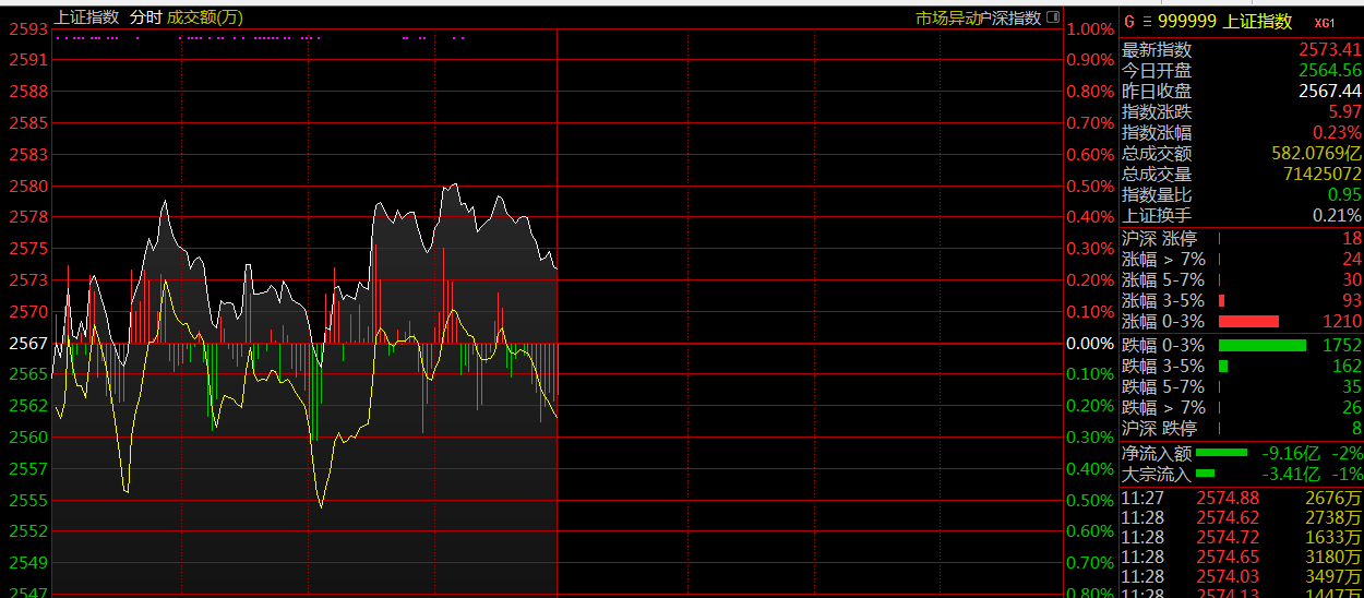 云財經(jīng)訊,截至早盤收盤,上證指數(shù)報2573點,漲0.23%;深證成指報7602點,漲0.08%;創(chuàng)業(yè)板指數(shù)報1312點,跌0.01%。盤面上,白酒、分散染料、鋰電池等板塊漲幅居前,天津自貿(mào)區(qū)、知識產(chǎn)權(quán)保護(hù)、高送轉(zhuǎn)等板塊跌幅居前。