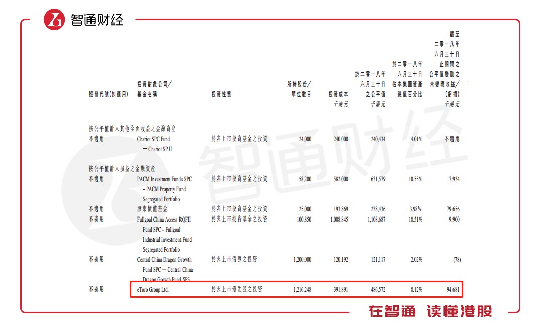 值得一提的是,中民金融的重大投資中,其于今年4月份才投資的eToro,截至2018年上半年期間的公平值變動(dòng)未變現(xiàn)損益為9468萬(wàn)港元,而該項(xiàng)投資僅占其資產(chǎn)總值的8.12%。