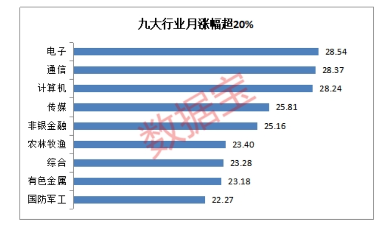 28個(gè)申萬一級(jí)行業(yè)中,有9個(gè)行業(yè)二月份的漲幅超過20%,電子、通信、計(jì)算機(jī)、傳媒、非銀金融行業(yè)漲幅超過25%,位列前五。28個(gè)行業(yè)的月平均漲幅為18.4%,行業(yè)普漲現(xiàn)象明顯。