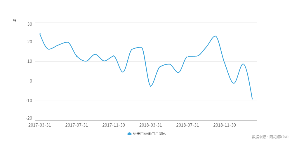 同時(shí),進(jìn)出口數(shù)據(jù)持續(xù)低迷。中國海關(guān)總署3月8日公布數(shù)據(jù)顯示,2019年2月,我國進(jìn)出口總值2663.6億美元,同比增長-13.8%。其中出口1352.4億美元,同比增長--20.7%;進(jìn)口1311.2億美元,同比增長-5.2%。