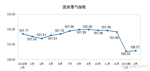 2月份,房地產(chǎn)開(kāi)發(fā)景氣指數(shù)(簡(jiǎn)稱“國(guó)房景氣指數(shù)”)為100.57,比2018年12月份回落1.27點(diǎn)。