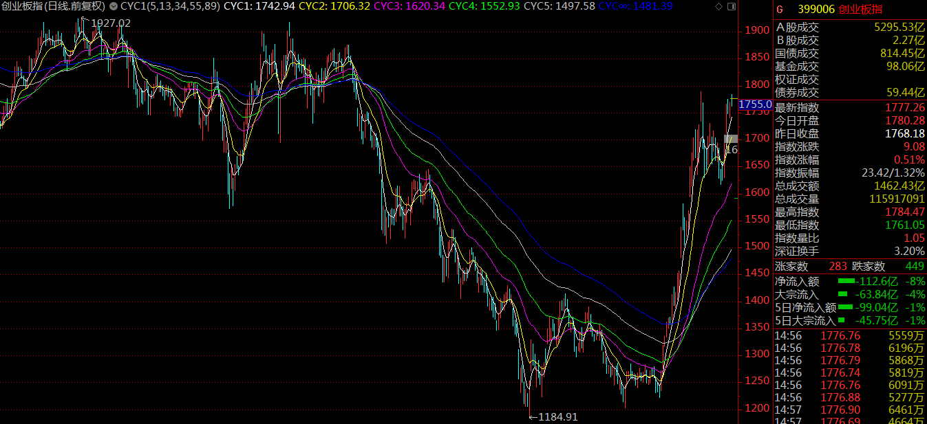 周一市場(chǎng)突破三月份的中樞結(jié)構(gòu),開(kāi)啟了新一輪的上漲,市場(chǎng)情緒良好,基本維持了日均百股漲停的規(guī)模。至周四,滬指上漲5.04%報(bào)收3246.57點(diǎn),深成指漲5.14%報(bào)收10415.8點(diǎn),創(chuàng)業(yè)板漲4.94%報(bào)收1777.26點(diǎn)。值得留意的是,相較于第一波行情創(chuàng)業(yè)板指數(shù)大幅跑贏上證指數(shù)來(lái)說(shuō),這一次代表小盤(pán)股的創(chuàng)業(yè)板指數(shù)要弱于預(yù)期。