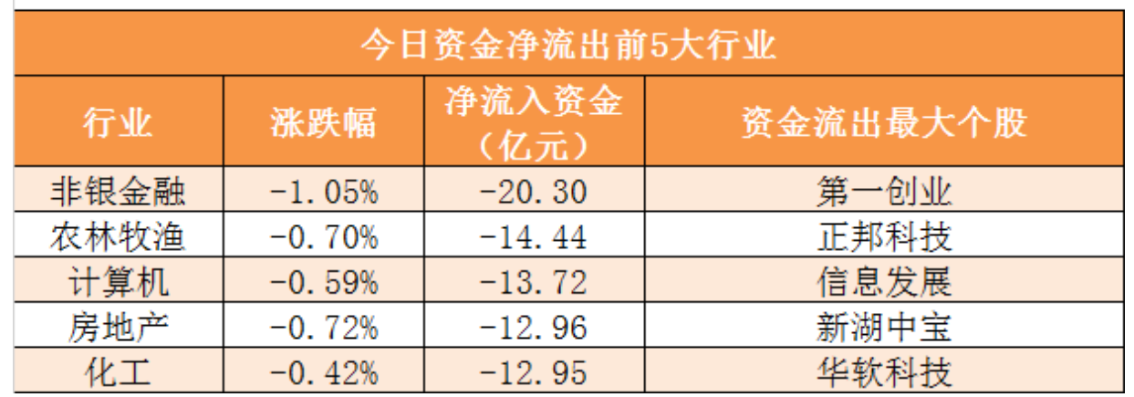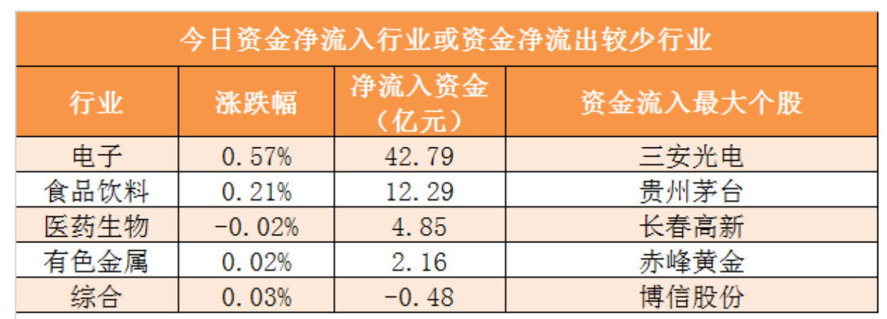 資金流向:28個申萬一級行業(yè)中,4個行業(yè)實現(xiàn)資金凈流入,其中電子行業(yè)凈流入42.79億元居首。