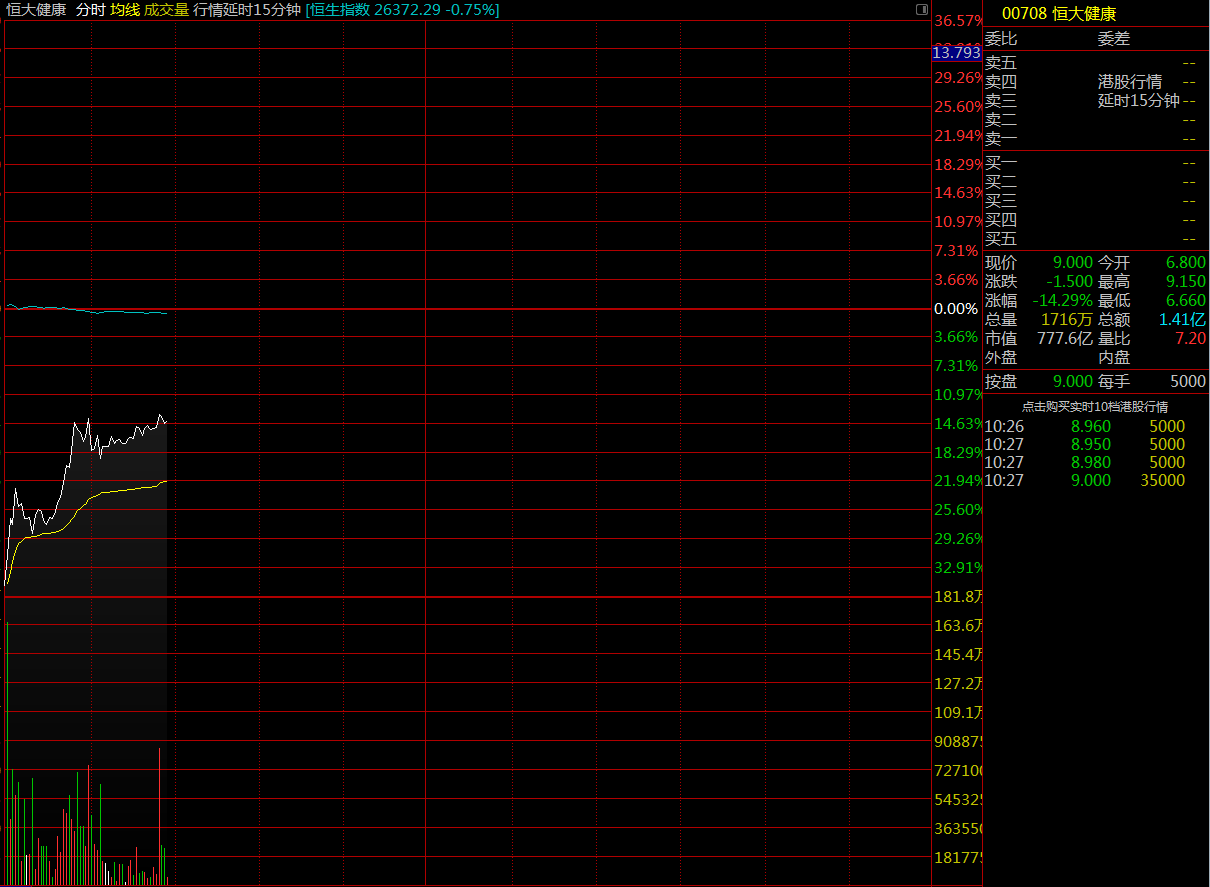 智通財經APP獲悉,恒大健康(00708)今日復牌,盤前股價下跌,截至9時20分,跌35.24%,報價6.8港元,成交額299.2萬。
