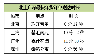 年貨節(jié)期間,每日優(yōu)鮮的配送小哥們紛紛開啟飛毛腿模式:廣州地區(qū)最快的一單用了11分33秒,深圳用了9分56秒。廣州地區(qū)的會員訂單平均配送時間42分15秒,深圳為40分53秒。消費者足不出戶,就可以享受到最新鮮的生鮮產(chǎn)品,比自己到菜市場采購更便捷更省時。