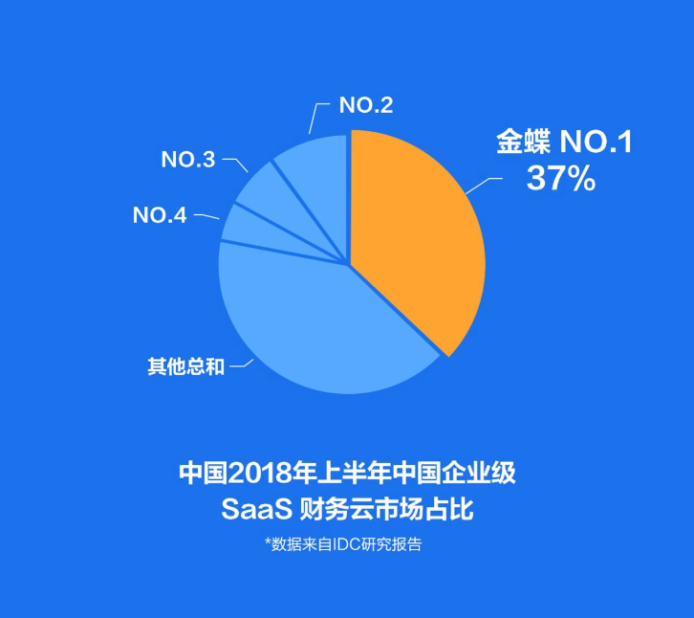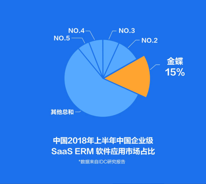 IDC 《中國半年度企業(yè)級 S aaS ERM 應用軟件市場跟蹤報告》,金蝶在2018上半年 SaaS ERM 和 SaaS 財務 云 市場 占比繼續(xù)蟬聯(lián)第一。
