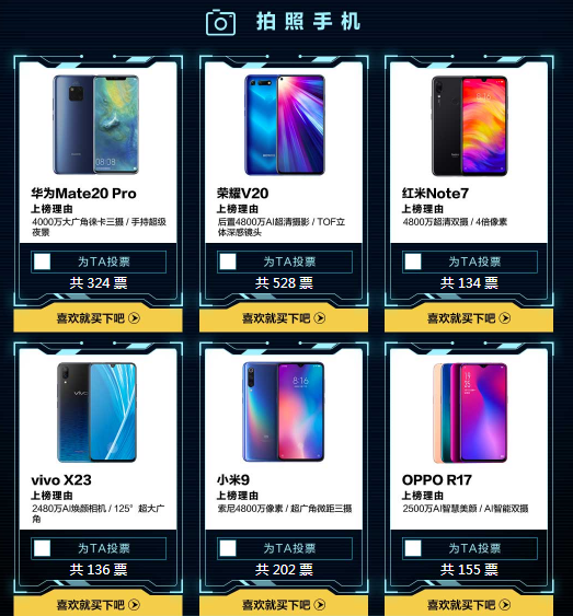 在手機(jī)類產(chǎn)品投票中,拍照手機(jī)候選產(chǎn)品分別為:華為Mate20 Pro、榮耀V20、紅米Note7、vivo X23、小米9和OPPO R17,截至3月12日榮耀V20暫時領(lǐng)先。