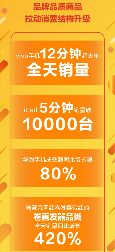 作為傳統(tǒng)優(yōu)勢(shì)品類,手機(jī)在今年618年中購物節(jié)首日的表現(xiàn)仍舊搶眼。vivo手機(jī)12分鐘超去年全天銷量,最終全天的銷量達(dá)到去年同期的11倍;華為手機(jī)成交額同比增長(zhǎng)超80%,華為手機(jī)配件成交額同比增長(zhǎng)超300%; iPad在5分鐘的銷量就突破萬臺(tái)。