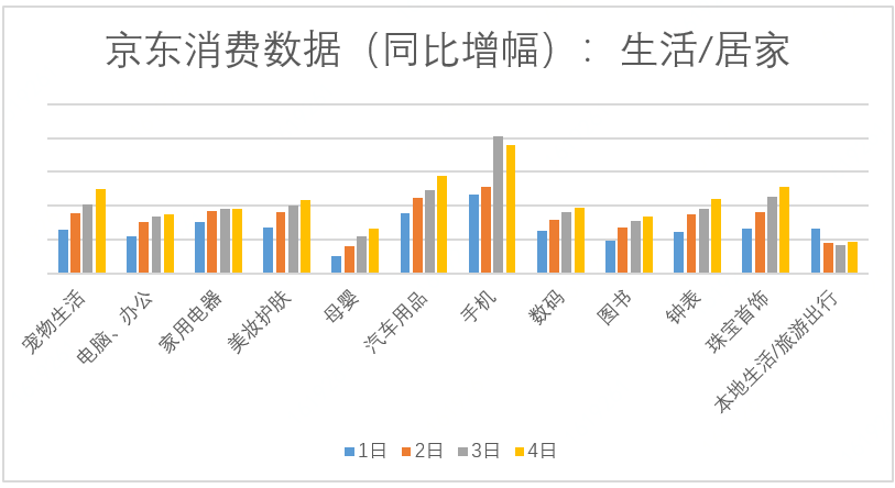 外出旅游如火如荼,“宅”在家中的朋友也不甘寂寞,趁著長假期間在京東平臺上為自己、家人或朋友挑選稱心的商品無疑是最佳的選擇。寵物生活、電腦、母嬰、美妝護膚、汽車用品、手機數(shù)碼等商品的銷量在1-4日內(nèi)持續(xù)增長,其中受“京東超級品牌日”等因素影響,手機類商品的銷售增長在3日達到峰值;有意思的是,一些看似與節(jié)日無關(guān)的消費如圖書、鐘表等相比去年也有較大的漲幅,體現(xiàn)了消費者的多元化需求;而國慶期間的“結(jié)婚潮”則拉高了珠寶首飾的相關(guān)銷售。