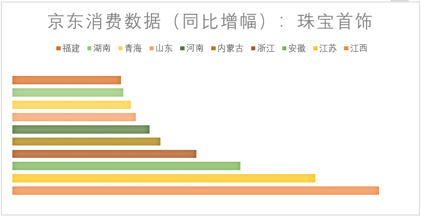 而在珠寶首飾的需求上,東南省份再次成為消費主力軍,其中江西省的同比增幅達到300%以上,看來在江西的小伙伴今年國慶期間可沒少參加婚禮。