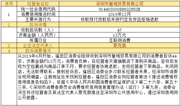 深圳新聞網(wǎng)2019年12月24日訊12月24日,為加強(qiáng)對(duì)商品和服務(wù)的社會(huì)監(jiān)督,推進(jìn)消費(fèi)領(lǐng)域信用體系建設(shè),深圳市消費(fèi)者委員會(huì)(以下簡(jiǎn)稱“深圳市消委會(huì)”)聯(lián)合福田區(qū)消費(fèi)者委員會(huì)(以下簡(jiǎn)稱“福田區(qū)消委會(huì)”)和龍崗區(qū)消費(fèi)者委員會(huì)(以下簡(jiǎn)稱“龍崗區(qū)消委會(huì)”)將深圳豬兼強(qiáng)互聯(lián)網(wǎng)科技有限公司、深圳市皇域貿(mào)易有限公司、深圳市百家順資產(chǎn)管理有限公司、深圳市予恩美容美發(fā)有限公司、深圳晶馨瑜伽有限公司等五家預(yù)付式和互聯(lián)網(wǎng)消費(fèi)領(lǐng)域停止?fàn)I業(yè)且未退還消費(fèi)者預(yù)付款項(xiàng)的經(jīng)營(yíng)者及其主要負(fù)責(zé)人推送至深圳市公共信用中心,通過深圳信用網(wǎng)公開披露。