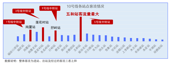 可以看到,10號線客流最大的為五和站。五和站作為10號線與5號線的中轉(zhuǎn)站,方便大量的5號線中轉(zhuǎn)人群。