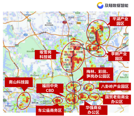 從熱力圖中可以看出,10號線乘客工作地主要集中在關(guān)外的三大片區(qū),分別是坂雪崗科技城、平湖產(chǎn)業(yè)園區(qū)、李朗產(chǎn)業(yè)園區(qū)。