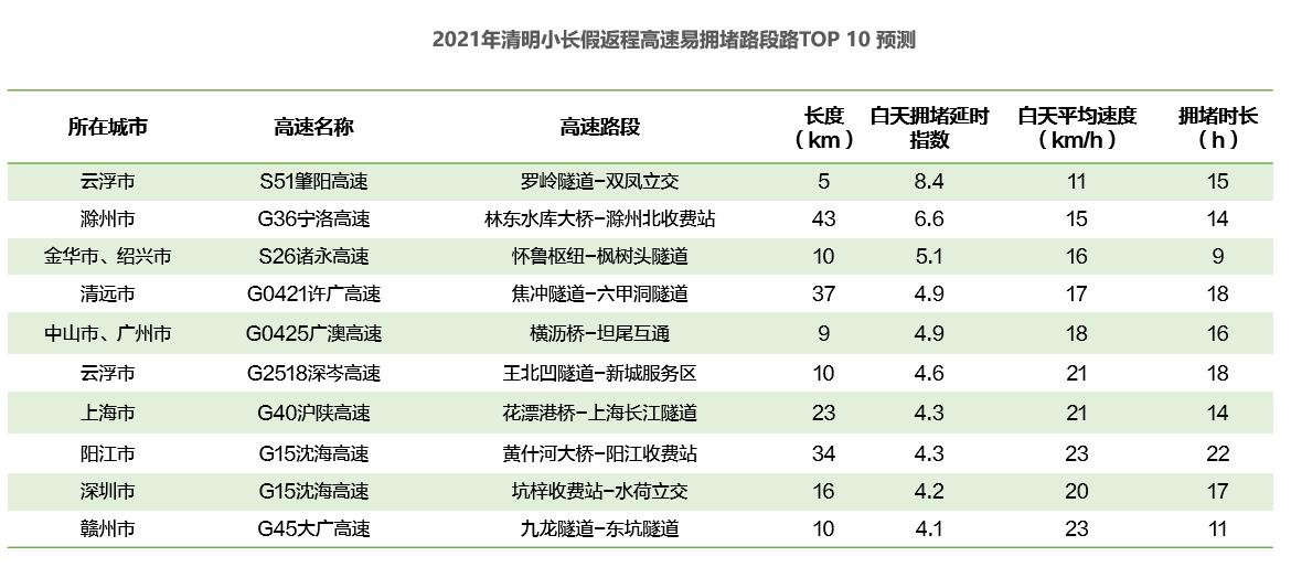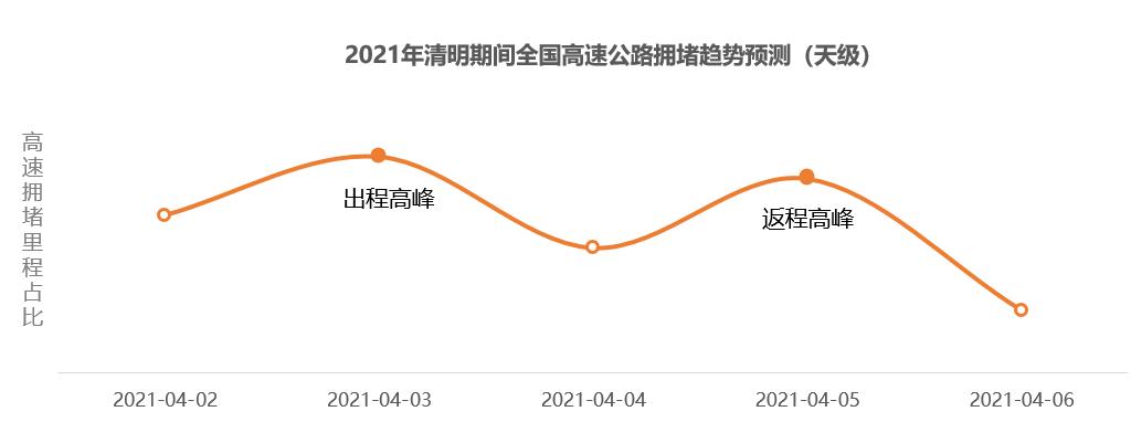 具體時段方面,預計2021年4月2日(清明小長假前一天)15時開始,全國高速交通壓力逐漸增大,20時至23時擁堵程度較高;4月3日(清明小長假第一天)8時至12時高速迎來出程擁堵高峰,預計10時至11時達峰值,4月5日(清明小長假最后一天)14時至19時為高速返程擁堵高峰。