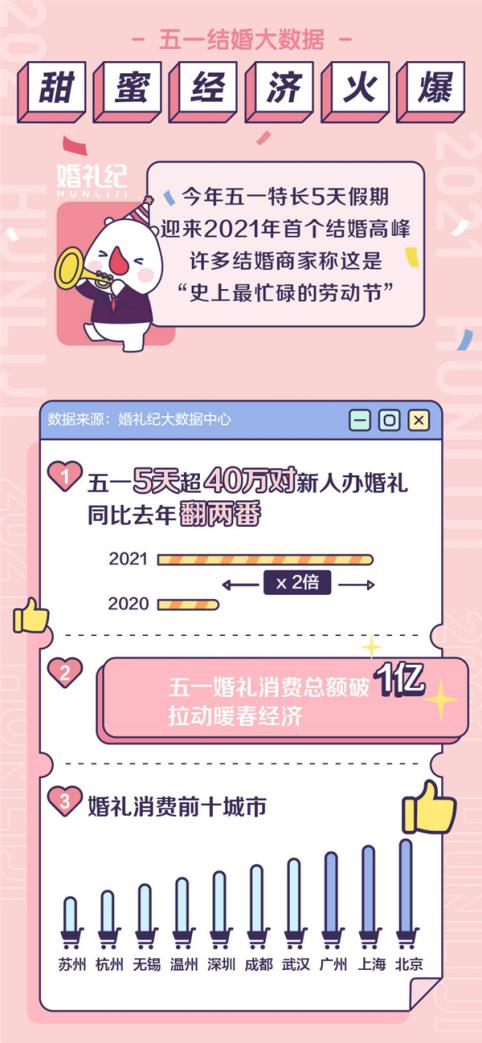 數(shù)據(jù)顯示,五一迎來2021年首個(gè)結(jié)婚高峰,5天內(nèi)超40萬對(duì)新人舉辦婚禮,同比去年翻兩番。五一婚禮消費(fèi)總額破1億,在一定程度上拉動(dòng)暖春經(jīng)濟(jì)?;槎Y消費(fèi)前十城市分別是北京、上海、廣州、武漢、成都、深圳、溫州、無錫、杭州、蘇州。