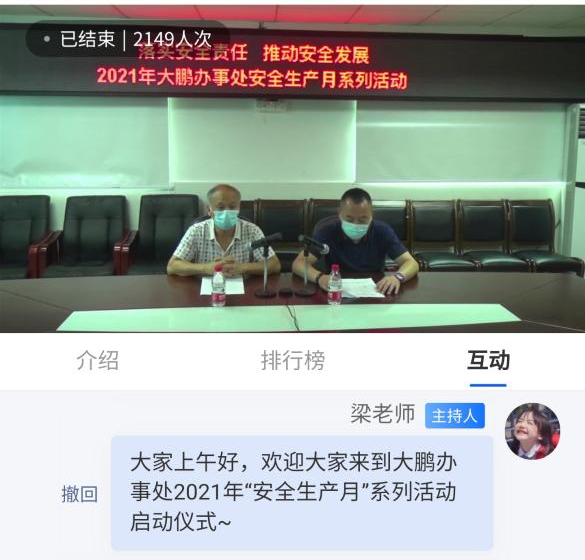 近日,大鵬辦事處組織開展了安全生產(chǎn)月系列活動,因疫情防控需要,此次啟動儀式采取線上直播的方式進(jìn)行,轄區(qū)2100余名居民熱情參與“走進(jìn)”會議現(xiàn)場,參與答題人數(shù)1750人,活動共計(jì)派發(fā)紅包635份。