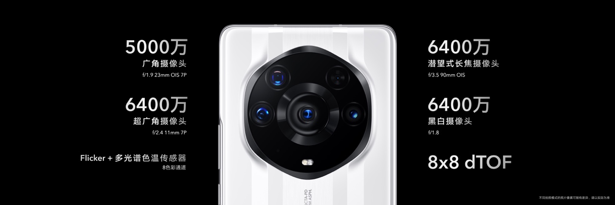影像方面,榮耀Magic3至臻版打破手機(jī)鏡頭天花板,突破性地采用了多主攝設(shè)計。在與榮耀 Magic3 Pro采用同樣的業(yè)界領(lǐng)先6400萬潛望式長焦鏡頭和6400萬黑白鏡頭基礎(chǔ)上,榮耀 Magic3至臻版將5000萬像素超大底主攝升級為索尼 IMX700,傳感器尺寸達(dá)到1/1.28英寸,擁有業(yè)界領(lǐng)先的感光度(ISO),成像解析力、暗光拍攝能力更強(qiáng)。而超廣角微距鏡頭,也從1300萬像素,升級為業(yè)界領(lǐng)先的6400萬像素126°超大廣角微距鏡頭,能完美呈現(xiàn)廣闊空間中整個建筑、地標(biāo),亦能捕捉2.5cm近距離下的微小細(xì)節(jié),提供肉眼無法看到的創(chuàng)意視角。多主攝計算攝影,實現(xiàn)多焦段高清影像。