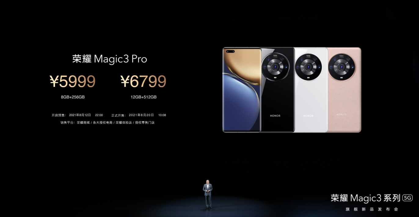 榮耀 M agic38GB+128GB版售價4599元,8GB+256GB版售價4999元;榮耀Magic3 Pro8GB+256GB版售價5999元,12GB+512GB版售價6799元;榮耀Magic3至臻版12GB+512GB售價7999元。8月12日22:00榮耀 Magic3系列手機(jī)正式開啟預(yù)售,8月20日10點08分,榮耀 M agic3系列手機(jī)將于榮耀商城、各大授權(quán)電商、榮耀體驗店、榮耀零售門店等全平臺開售。