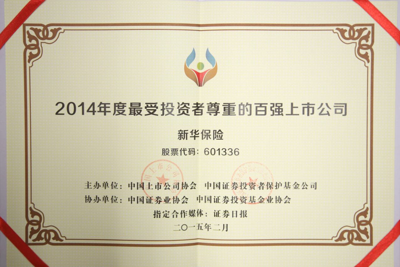2015年2月,在中國(guó)上市公司協(xié)會(huì)、中國(guó)證券投資者保護(hù)基金公司主辦,中國(guó)證券業(yè)協(xié)會(huì)、中國(guó)證券投資基金業(yè)協(xié)會(huì)協(xié)辦的評(píng)選中,新華保險(xiǎn)獲得2014年度最受投資者尊重的百?gòu)?qiáng)上市公司。