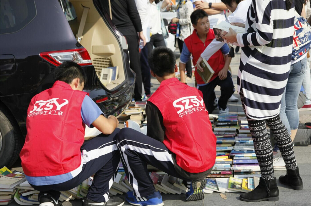 深圳市實(shí)驗(yàn)中學(xué)的車尾箱展位前圍滿了前來(lái)?yè)Q書(shū)的人