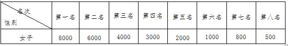 根據(jù)槍聲計(jì)時(shí)成績錄取女子第一名至第五十名運(yùn)動員現(xiàn)場頒發(fā)獲獎(jiǎng)證書,前八名并分別獲得獎(jiǎng)金(單位:人民幣元),前三名另外頒發(fā)獎(jiǎng)杯一座、完賽獎(jiǎng)牌一枚、領(lǐng)獎(jiǎng)服裝一套。