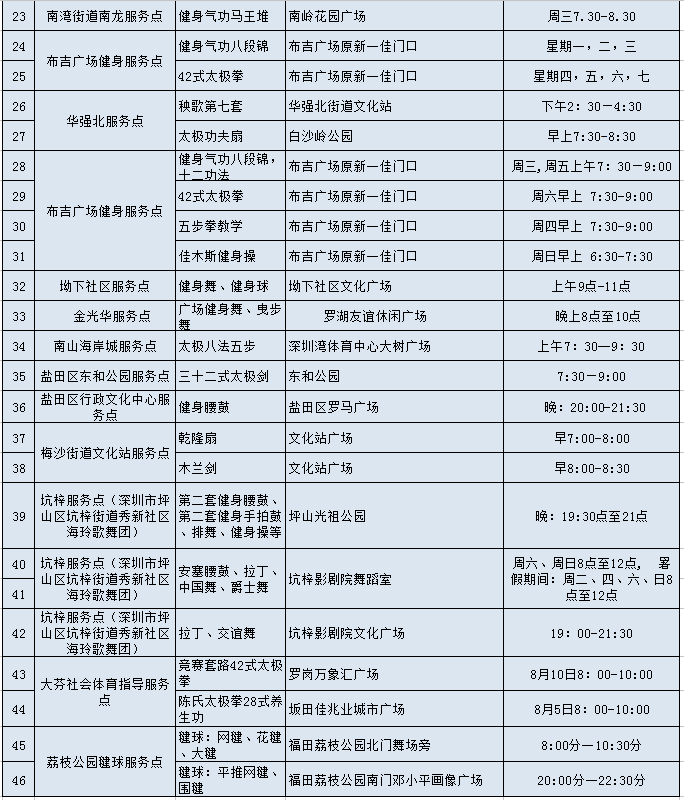????2018年8月8日,經(jīng)深圳市文體旅游局統(tǒng)計(jì),在“全民健身日”期間,深圳將有近50個(gè)全民健身站點(diǎn),為市民提供健身科普、大講堂、免費(fèi)咨詢(xún)及健身指導(dǎo)等,健身內(nèi)容涵蓋武術(shù)、舞蹈、健身操、球類(lèi)等眾多項(xiàng)目。