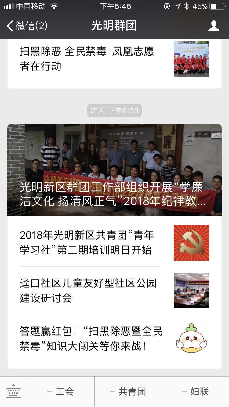 案例介紹:深圳市光明新區(qū)群團(tuán)工作部公眾賬號,包括光明工會、光明團(tuán)委、光明婦聯(lián),發(fā)布新聞資訊、提供便捷服務(wù)。
