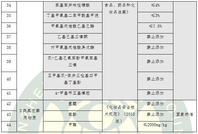 c.防曬劑(15種):苯基苯并咪唑磺酸、二苯酮 -4和二苯酮-5、對氨基苯甲酸、對甲氧基肉桂酸異戊酯、 PABA乙基己酯、丁基甲氧基二苯甲?;淄?、奧克立林、甲氧基肉桂酸乙基己酯、水楊酸乙基己酯、胡莫柳酯、乙基己基三嗪酮、亞甲基雙 -苯并三唑基四甲基丁基酚、雙 -乙基己氧苯酚甲氧苯基三嗪、二苯酮 -3、4-甲基芐亞基樟腦