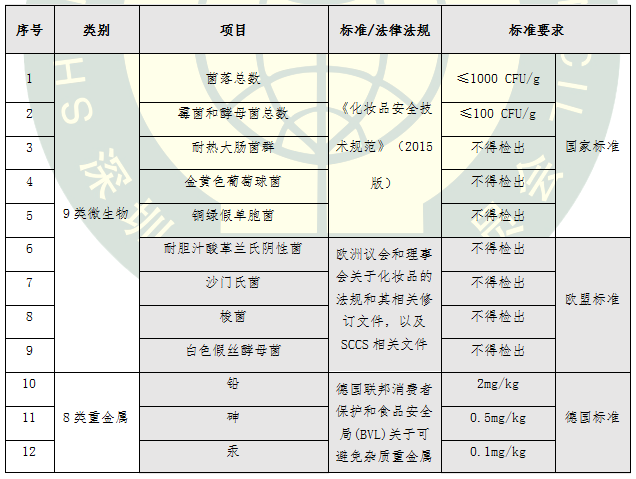 本次比較試驗檢測項目廣泛征求了企業(yè)、業(yè)內專家和第三方檢測機構的意見,不僅依據了現(xiàn)行國家標準,而且在國標基礎上結合嚴格的歐盟標準 《歐盟化妝品法規(guī)EC1223/2009及其相關修訂文件》、《歐盟消費者安全科學委員會(SCCS)關于化妝品安全的第九版指南》、德國聯(lián)邦消費者保護和食品安全局(BVL)關于可避免雜質重金屬限值的調查報告、美國《聯(lián)邦食品、藥品和化妝品法案》、日本厚生勞動省《藥事法》以及其它相關標準、法規(guī)和技術文件的要求,采用國家標準檢測方法、實驗室通用方法等手段進行檢測,從44項指標展開氣墊粉底安全性品質大比拼,詳細項目與要求見表1。