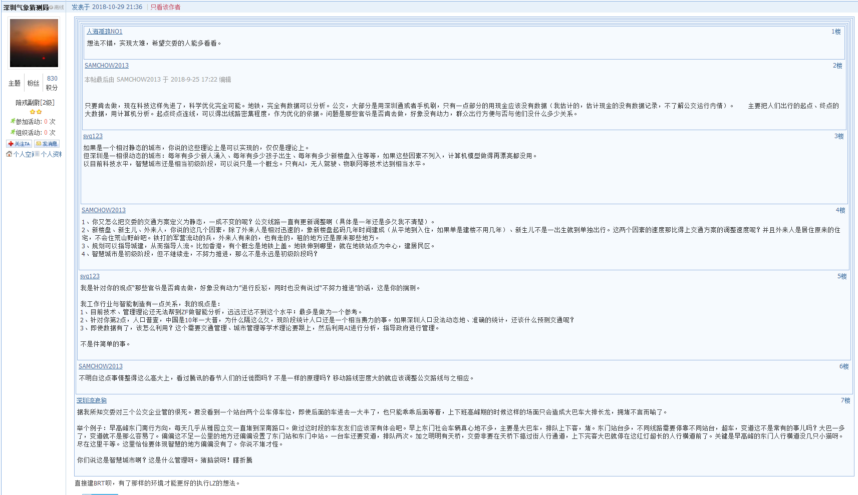 9月25日有市民在深圳論壇以《關(guān)于公交線(xiàn)路規(guī)劃和站臺(tái)設(shè)置的一點(diǎn)建議》為題發(fā)帖,自稱(chēng)是曾經(jīng)的公交人和現(xiàn)在的私家車(chē)駕駛員,對(duì)深圳的公交出行一口氣提出3個(gè)意見(jiàn)。帖文中最為吸引人眼球的觀(guān)點(diǎn)就是“將全市各站點(diǎn)進(jìn)行編號(hào),采用計(jì)算機(jī)技術(shù),對(duì)編號(hào)站點(diǎn)進(jìn)行排列組合,每個(gè)方向連續(xù)的10個(gè)站點(diǎn)有三條線(xiàn)路覆蓋,超出三條屬于線(xiàn)路密度高或規(guī)劃不合理?!眴芜@一句話(huà)就在跟帖中引發(fā)了針?shù)h相對(duì)的辯論,有支持的市民認(rèn)為:主意不錯(cuò),實(shí)現(xiàn)起來(lái)應(yīng)該也難度不大。現(xiàn)在不是整天提什么物聯(lián)網(wǎng)、大數(shù)據(jù)、智慧城市么,這個(gè)不就是這些高新技術(shù)在公交出行方面的應(yīng)用。不看好的市民則認(rèn)為:目前技術(shù)、管理理論還無(wú)法做智能分析,遠(yuǎn)遠(yuǎn)還達(dá)不到這個(gè)水平,“最多是做為一個(gè)參考”。