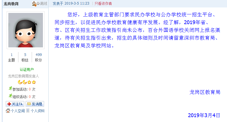 3月3日,有網(wǎng)友“清熱解毒”在深圳論壇以《不到24小時(shí),百合外國語學(xué)校網(wǎng)上報(bào)名,為何突然關(guān)閉...》為題發(fā)帖反映,“3月1日(周五)深圳眾多小學(xué)6年級(jí)家長都收到了通知,百合外國語學(xué)校的信息填報(bào)時(shí)間為3月2日到3月5日?!啊捌届o的周末被百外半夜的一則公告打亂了,家長們更是被突如其來的新生登記急蒙了”。