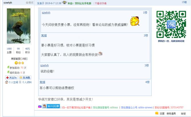 記者從問政平臺(tái)得知,5月底以來,還有市民發(fā)帖反映,除華潤(rùn)萬(wàn)家外,科技園萬(wàn)象天地華潤(rùn)Ole、僑香路沃爾瑪?shù)瘸幸泊嬖诓惶峁┘堎|(zhì)購(gòu)物小票的情況。目前,市民仍然普遍認(rèn)同超市應(yīng)主動(dòng)提供紙質(zhì)購(gòu)物小票,避免顧客被價(jià)格欺詐。有市民表示:“遇到最多的是優(yōu)惠打折,實(shí)際還是原價(jià)買單,這時(shí),手中有小票一目了然,不花冤枉錢?!边€有市民質(zhì)疑,“奸商,動(dòng)不動(dòng)就打著環(huán)保這些高大上的理由作借口”。同時(shí),也有市民體驗(yàn)過微信小票后表示,“沃爾瑪手機(jī)掃碼付款是沒有紙票,購(gòu)物小票藏在微信公眾號(hào)里,退換貨就在那里面進(jìn)行。這就是科技發(fā)達(dá)帶來的豐碩成果,挺好的?!苯刂劣浾甙l(fā)稿時(shí),市民關(guān)于科技園萬(wàn)象天地華潤(rùn)Ole、僑香路沃爾瑪?shù)瘸胁惶峁┵?gòu)物小票的帖文還沒有得到相關(guān)部門回應(yīng)。